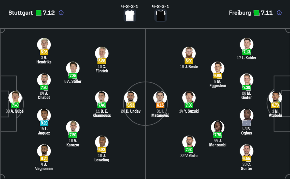 สตุ๊ตการ์ทยังยึดระบบ 4-2-3-1 โดยมี อเล็กซานเดอร์ นูเบิล เฝ้าเสา แนวรับใช้งาน โยชัว ฟ้ากโนมัน, รามอน เฮนดริคส์, เจฟฟ์ ชาบ็อต และ ลอริส ยาคูเอซ แดนกลางเป็น อตาคาน คาราซอร์ กับ อังเจโล่ สติลเลอร์ ส่วนเกมรุกวาง เจมี่ เลเวลลิ่ง, บิลาล เอล คานนูส, คริส ฟูห์ริช สนับสนุน เดนิซ อุนดาฟ