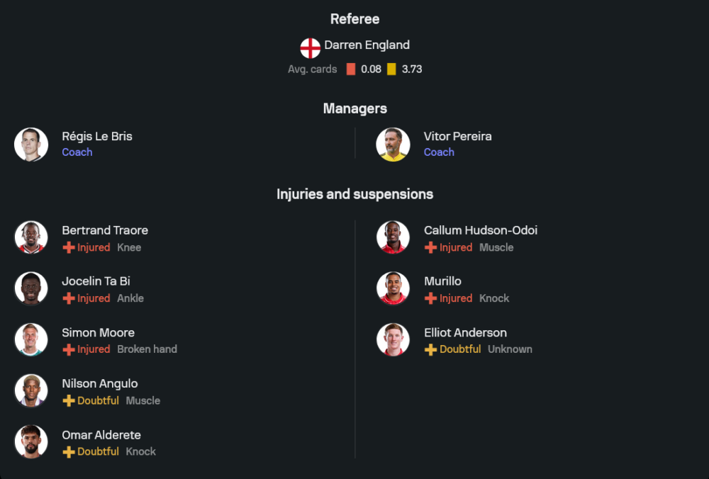 ฝั่งวิตอร์ เปไรร่า ยังมีปัญหาผู้เล่นบาดเจ็บบางจุด โดยเฉพาะคัลลัม ฮัดสัน โอดอย และมูริลโล่ที่ยังไม่เต็มร้อย แต่ภาพรวมถือว่าดูลงตัวกว่าเดิม ระบบ 4-2-3-1 จะใช้มัตซ์ เซลส์ ยืนด่านสุดท้าย กองหลังมีโอลา ไอนา, มิเลนโควิช, โมราโต้ และนีโก วิลเลียมส์ แดนกลางใช้ซ็องกาเร่กับเอลเลียต แอนเดอร์สัน ส่วนแนวรุกวางบัควา, กิ๊บบ์ส ไวท์, ฮัตชินสัน และอิกอร์ เฮซุส ที่พร้อมเปลี่ยนเกมได้ทุกเมื่อ