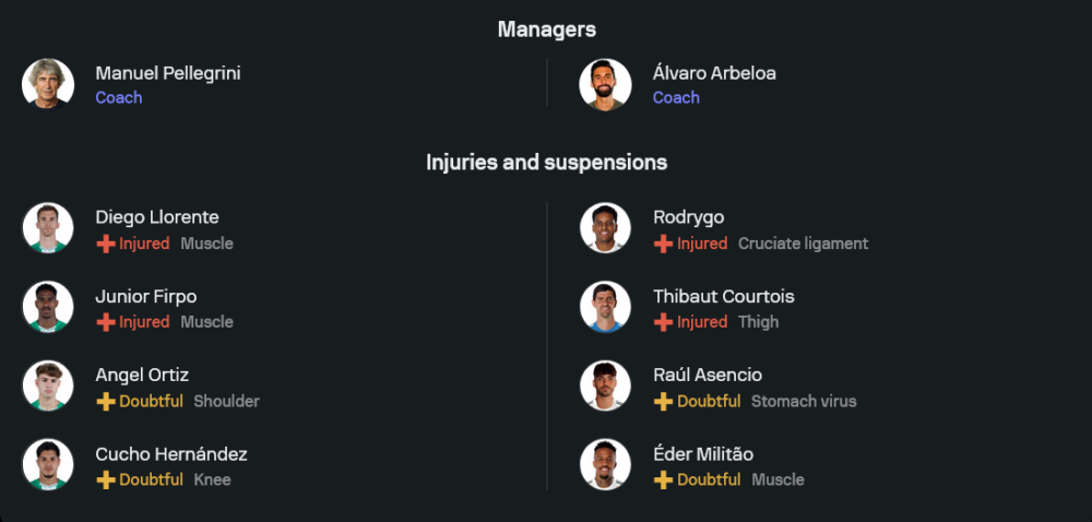 ทีมของ มานูเอล เปเยกรินี่ เพิ่งปลดล็อกชัยสำคัญหลังบุกชนะกิโรน่า 3-2 ทำให้บรรยากาศในทีมกลับมาคึกคักอีกครั้ง สภาพขุมกำลังยังมีตัวเจ็บบางราย โดย ดีเอโก้ ยอเรนเต้ และ จูเนียร์ ฟีร์โป ยังมีปัญหาเรื่องความฟิต ส่วนบางตำแหน่งยังต้องเช็กอาการก่อนเกม แต่โครงสร้างหลักยังถือว่าใช้การได้ครบพอสมควร