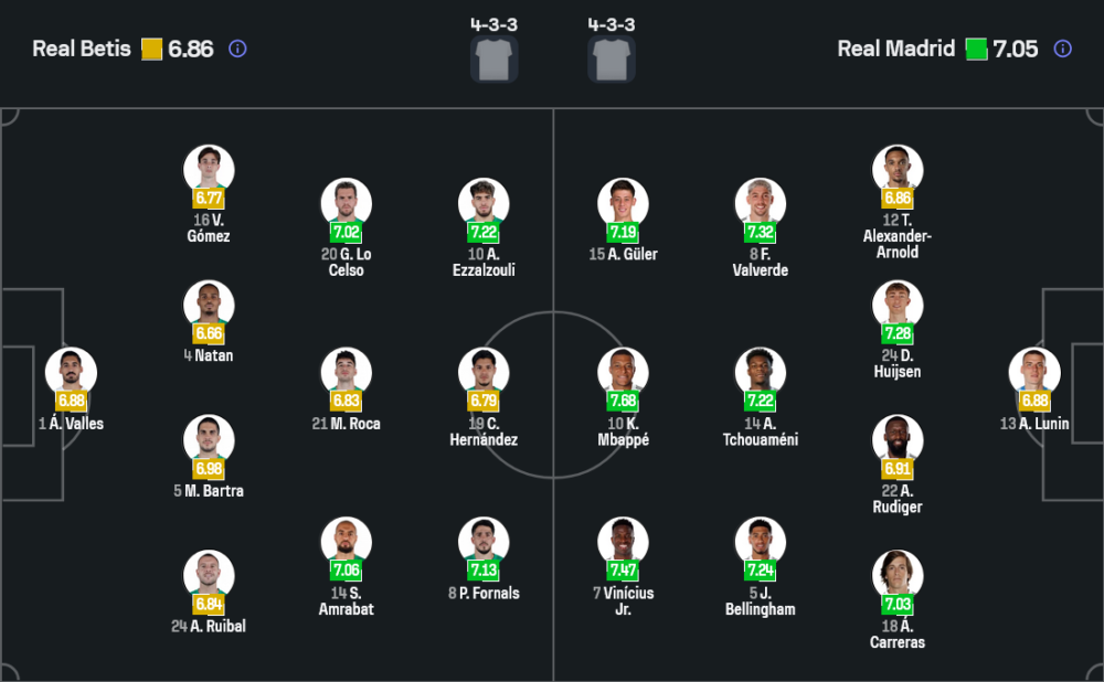 เบติสน่าจะยึดระบบ 4-3-3 ตามภาพรวมตัวจริงที่คาดไว้ ผู้รักษาประตูเป็น อัลบาโร่ บาเยส แผงหลังมี ไอตอร์ รุยบัล, มาร์ก บาร์ตร้า, นาตาน และ วีโตร์ โกเมซ แดนกลางใช้ ซอฟยาน อัมราบัต, มาร์ก โรก้า และ โจวานี่ โล เซลโซ ขับเคลื่อนเกม ส่วนแนวรุกวาง อับเด เอซซาลซูลี่, ปาโบล ฟอร์นัลส์ และ คูโช่ เอร์นานเดซ จุดขายของทีมชุดนี้คือความแน่นในแดนกลางและการโจมตีจากพื้นที่ด้านข้าง