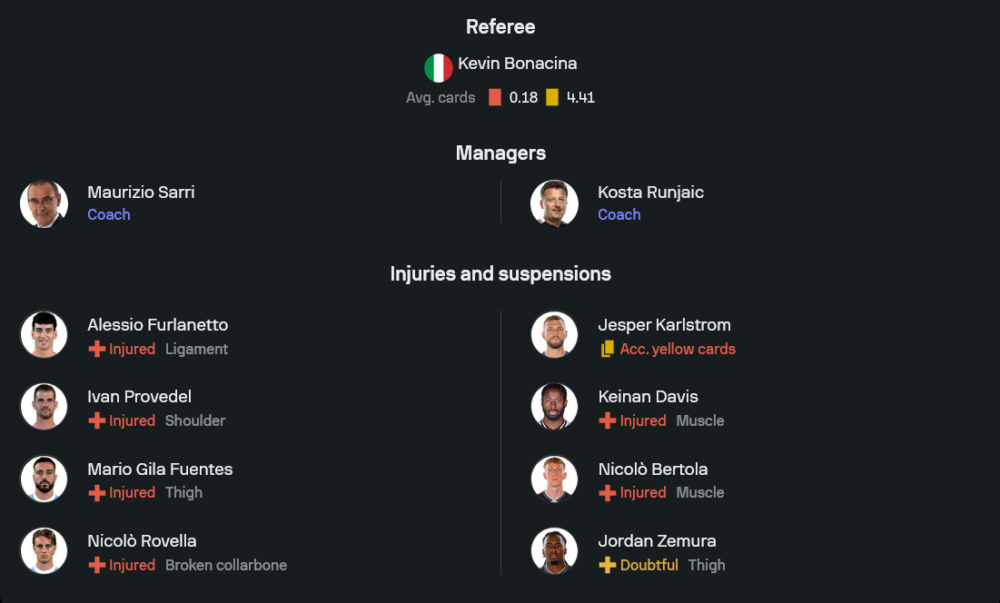 อูดิเนเซ่ของ คอสต้า รุนยาอิช วางหมากมาในระบบ 3-4-2-1 เน้นโครงสร้างแน่นและรอเล่นจังหวะสวนกลับ ผู้รักษาประตูเป็น มาดูก้า โอโคเย่ แนวรับสามคนใช้ โธมัส คริสเตนเซ่น, คริสเตียน คาบาเซเล่ และ อูมาร์ โซเลต์ วิงแบ็กสองฝั่งคือ คิงส์ลี่ย์ เอฮิซิบวย กับ ฮัสซาเน กามาร่า ตรงกลางมี ยาคุบ ปิโอครอฟสกี้ จับคู่ โอเยร์ ซาร์รากา โดยมี เยอร์เก้น เอคเคเลนคัมป์ และ อาร์ตูร์ อัตตา คอยสนับสนุน นิโคโล่ ซานิโอโล่ ในแดนหน้า อย่างไรก็ตามทีมเยือนเสีย เยสเปอร์ คาร์ลสตรอม ที่ติดโทษแบน รวมถึง คีแนน เดวิส, นิโคโล่ แบร์โตล่า และ จอร์แดน เซมูร่า ที่ไม่สมบูรณ์ ทำให้เกมนี้ต้องอาศัยวินัยทั้งทีมมากกว่าพึ่งความสามารถเฉพาะตัว