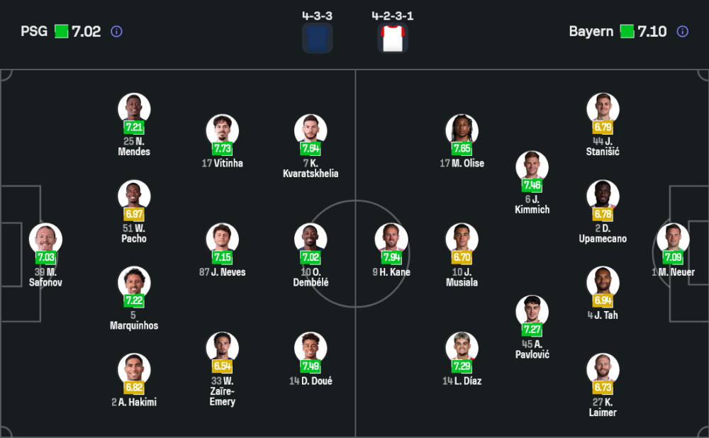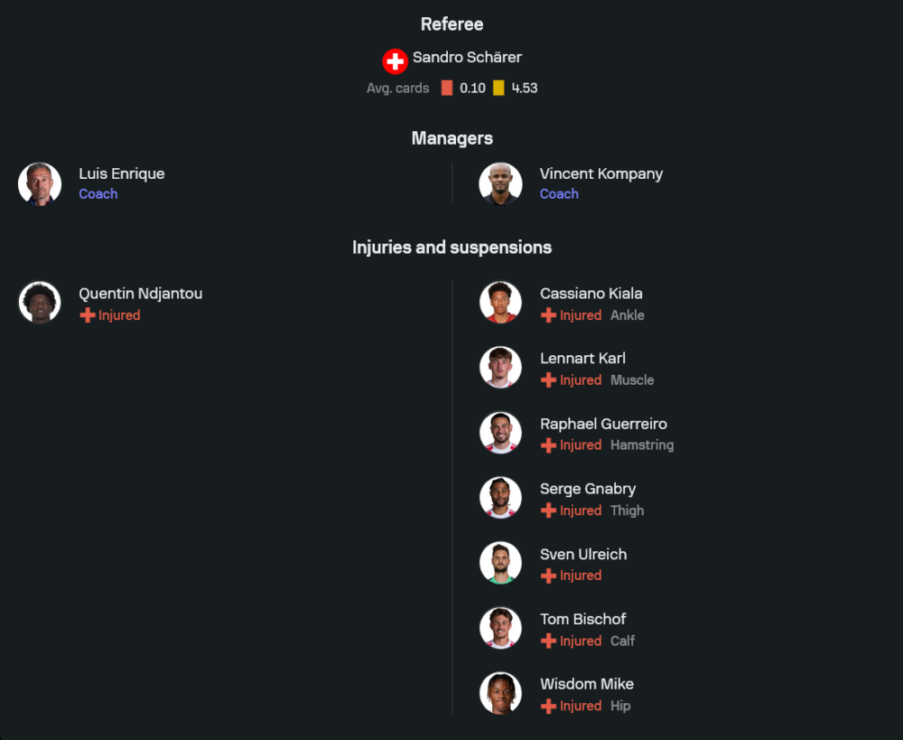 เจ้าบ้านของ หลุยส์ เอ็นริเก้ มาในระบบ 4-3-3 ที่เน้นความเร็ว ความสด และการเพรสซิ่งตั้งแต่แดนบน แนวรับใช้ มัตเวย์ ซาโฟนอฟ เฝ้าเสา แบ็กขวาเป็น อาชราฟ ฮาคิมี่ คู่เซ็นเตอร์มี มาร์กินญอส ยืนกับ วิลเลี่ยม ปาโช ส่วนแบ็กซ้ายได้ นูโน่ เมนเดส ที่มีพลังเติมเกมจัดจ้าน แดนกลางวาง วาร์เรน ซาอีร์-เอเมรี่, เจา เนเวส และ วิตินญ่า เป็นตัวคุมจังหวะ ขณะที่แนวรุกสามประสานใช้ เดซิเร่ ดูเอ้, อุสมาน เดมเบเล่ และ ควิช่า ควารัตสเคเลีย โดยมี เควนติน เอ็นฌ็องตู เป็นรายชื่อบาดเจ็บที่หมดสิทธิ์ช่วยทีม