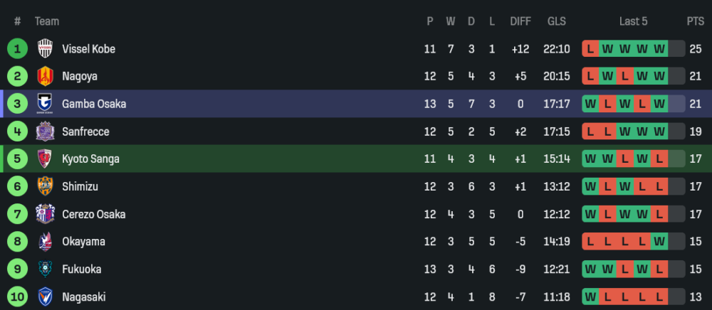 ฝั่งกัมบะ 5 นัดหลังมีทั้งความดุดันและความไม่นิ่งปะปนกัน ชนะ 2 เสมอ 1 แพ้ 2 โดยเพิ่งเสมอ วี-วาเรน นางาซากิ 1-1 ก่อนหน้านั้นแพ้ ฟุกุโอกะ 1-2 แต่ก็มีเกมถล่ม แบงค็อก ยูไนเต็ด 3-0 ในถ้วยเอเชียให้เห็นว่าศักยภาพเกมรุกยังน่ากลัว ภาพรวมฤดูกาลนี้ลงเล่น 10 นัด ชนะ 2 เสมอ 5 แพ้ 3 ยิง 14 เสีย 13 ประตู ผลต่าง +1 จุดแข็งคือเล่นนอกบ้านไม่กลัวใคร แต่ปัญหาคือบางช่วงเกมหลุดสมาธิและเสียประตูง่ายเกินไป