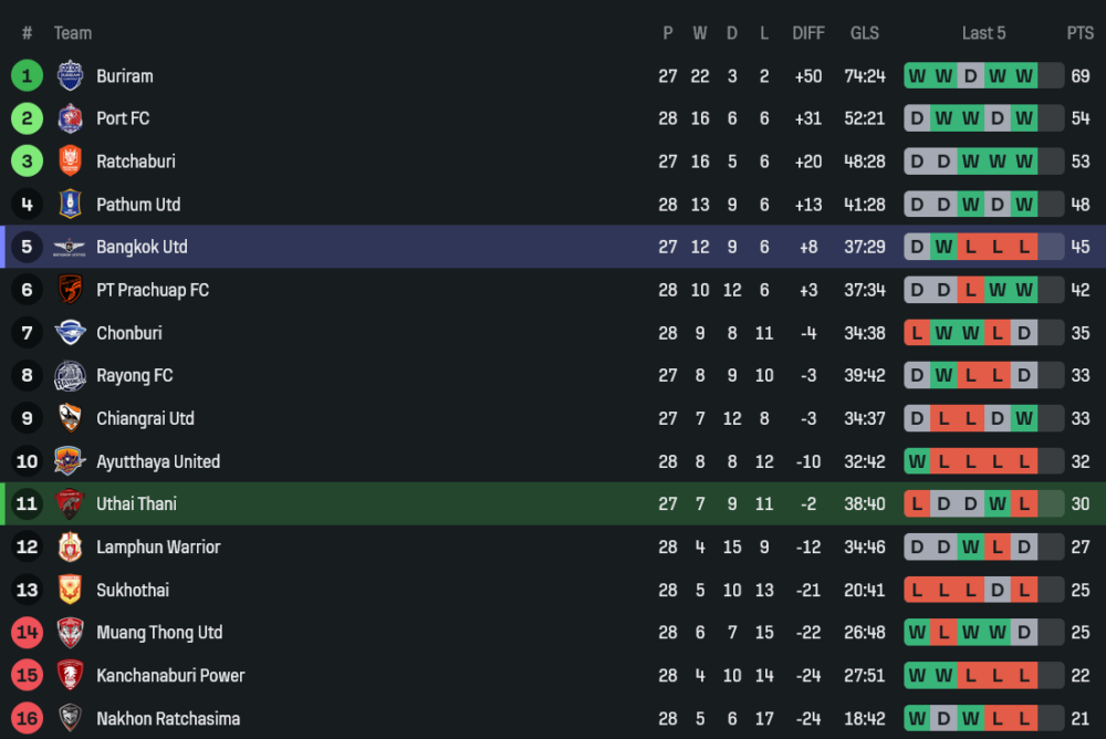 อุทัยธานีฤดูกาลนี้ลงเล่น 27 นัด ชนะ 7 เสมอ 9 แพ้ 11 ยิงได้ 38 ประตู เสีย 40 ประตู ค่าเฉลี่ยเกมรุกยังพอมีพิษสง แต่เกมรับยังเป็นจุดที่ต้องระวัง ขณะที่ ทรู แบงค็อก ยูไนเต็ด ผ่าน 27 นัด ชนะ 12 เสมอ 9 แพ้ 6 ยิงได้ 37 ประตู เสีย 29 ประตู ตัวเลขโดยรวมดูแน่นกว่า แต่ฟอร์มล่าสุดของแข้งเทพกำลังเป๋หนักจนความมั่นใจสั่นคลอนพอสมควร