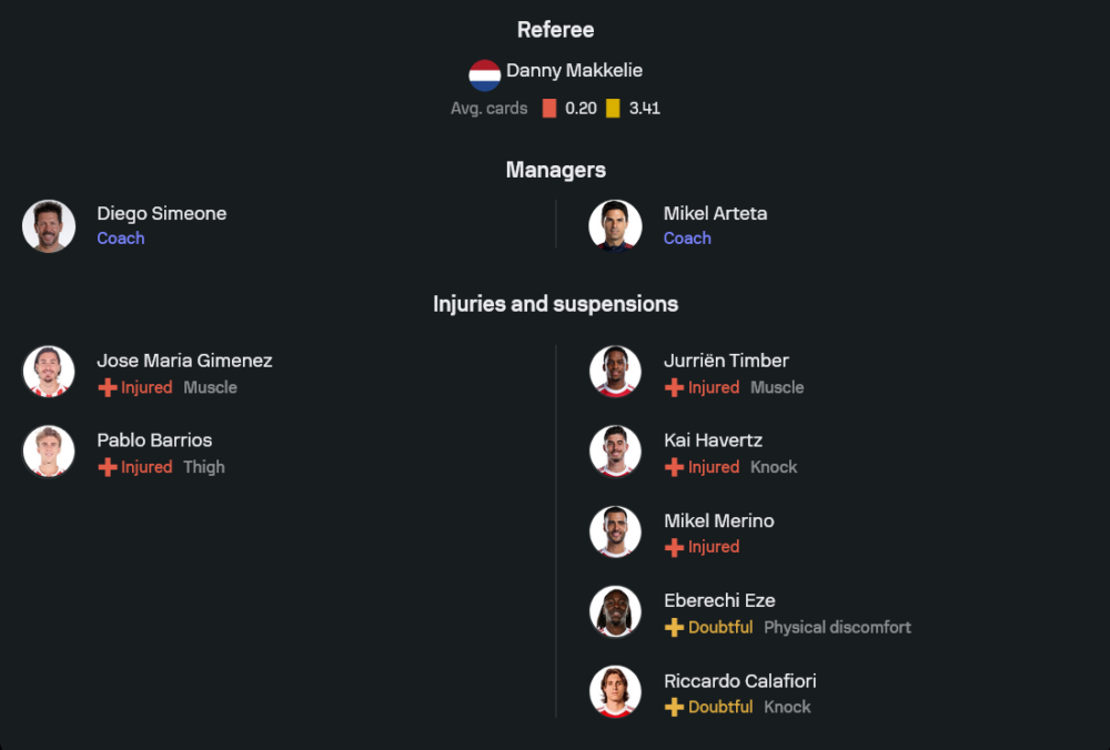 ปัญหาของตราหมีคือสภาพทีมยังไม่เต็มร้อย โฆเซ่ มาเรีย กิเมเนซ และ ปาโบล บาร์ริออส ยังมีอาการบาดเจ็บ ทำให้ ซิเมโอเน่ ต้องจัดสมดุลเกมรับให้แน่นเป็นพิเศษ เพราะคู่แข่งอย่างอาร์เซนอลมีความเร็วและการเคลื่อนที่ในแดนหน้าที่อันตรายมาก