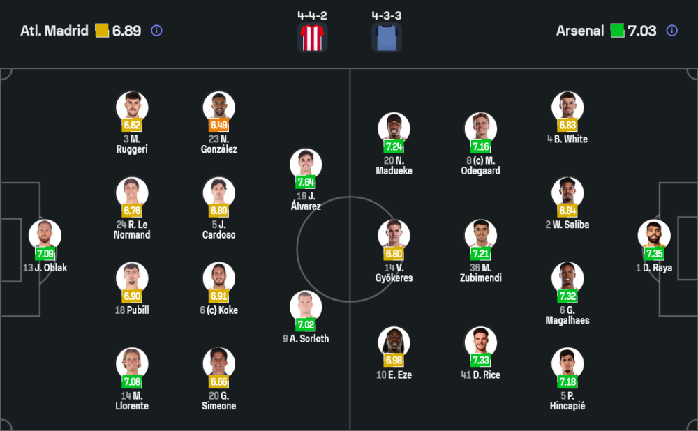 แอตฯ มาดริด ของ ดิเอโก้ ซิเมโอเน่ เตรียมยึดระบบ 4-4-2 ตามถนัด โดยมี ยาน โอบลัค เฝ้าเสา แนวรับประกอบด้วย มัตเตโอ รุจเจรี่, นอร์แมนด์, มาร์ก ปูบิลล์ และ มาร์กอส ญอเรนเต้ ส่วนแดนกลางใช้ จอห์นนี่ คาร์โดโซ่ กับ โกเก้ เป็นแกนหลักคุมจังหวะ ริมเส้นมี อเล็กซ์ บาเอน่า และ จูเลียโน่ ซิเมโอเน่ คอยเติมเกม ขณะที่คู่หน้าเป็น อเล็กซานเดอร์ ซอร์ลอธ จับคู่กับ ฮูเลี่ยน อัลวาเรซ