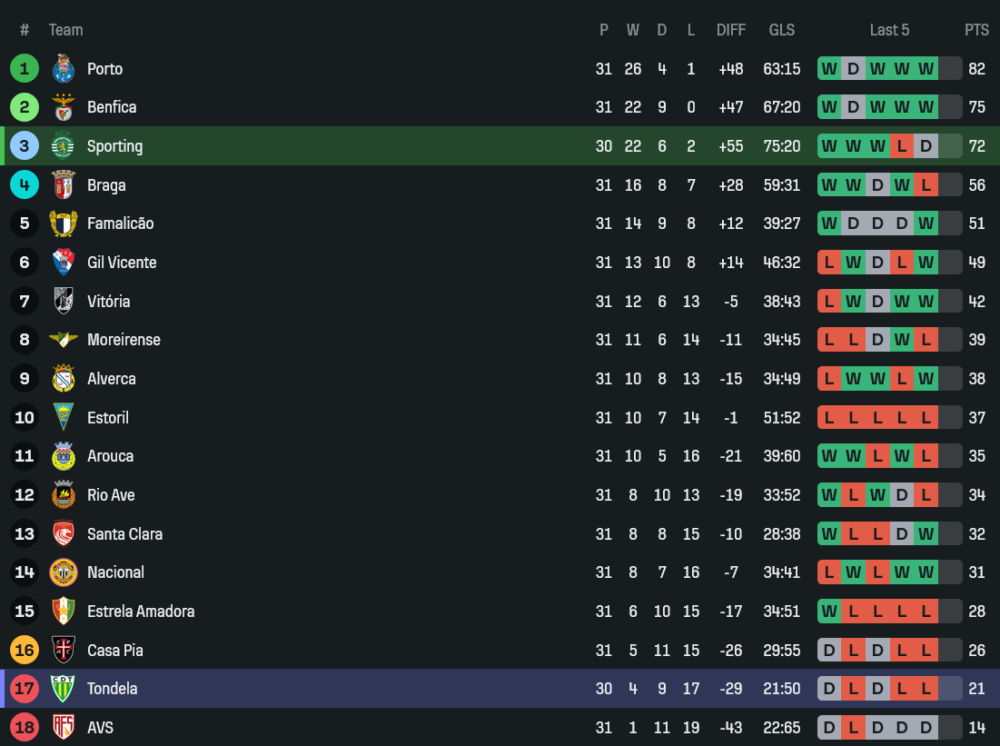 ทอนเดล่าฟอร์มกำลังเป๋หนัก 5 นัดหลังสุดไม่ชนะใคร แพ้ นาซิอองนาล 0-2, แพ้ ปอร์โต้ 0-2, เสมอ กิล วิเซนเต้ 2-2, แพ้ วิตอเรีย กิมาไรส์ 0-5 และเสมอ เอวีเอส 0-0 ปัญหาใหญ่คือเกมรับเสียประตูง่าย โดยเฉพาะเวลาเจอทีมที่สปีดบอลเร็ว ส่วนเกมเยือนในลีก 14 นัด ชนะ 3 เสมอ 2 แพ้ 9 ยิงได้แค่ 10 แต่เสียไปถึง 29 ลูก นี่คือจุดที่น่าห่วงที่สุด เพราะการมาเจอสปอร์ติ้งที่ต้องการชัยชนะเพื่อเรียกศรัทธา อาจกลายเป็นคืนที่ทีมเยือนต้องตั้งรับแบบหลังพิงฝา