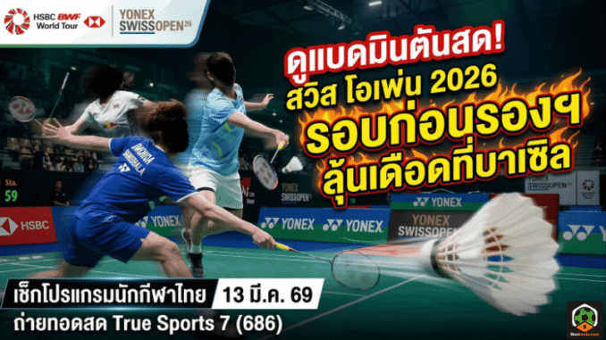 ศึก สวิส โอเพ่น 2026 เดินมาถึงรอบก่อนรองชนะเลิศแล้ว และวันศุกร์ที่ 13 มีนาคม 2569 ถือเป็นอีกหนึ่งคิวสำคัญของทัพนักแบดไทยที่ยังมีโปรแกรมลงสนามต่อเนื่องหลายคู่ ทั้งชายคู่ คู่ผสม และหญิงเดี่ยว ที่พร้อมล่าตั๋วเข้าสู่รอบตัดเชือดแบบเข้มข้น