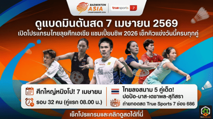 ดูแบดมินตันสด 7 เมษายน 2569 เปิดโปรแกรมไทยลุยศึกเอเชีย แชมเปี้ยนชิพ 2026 เช็กคิวแข่งวันนี้ครบทุกคู่