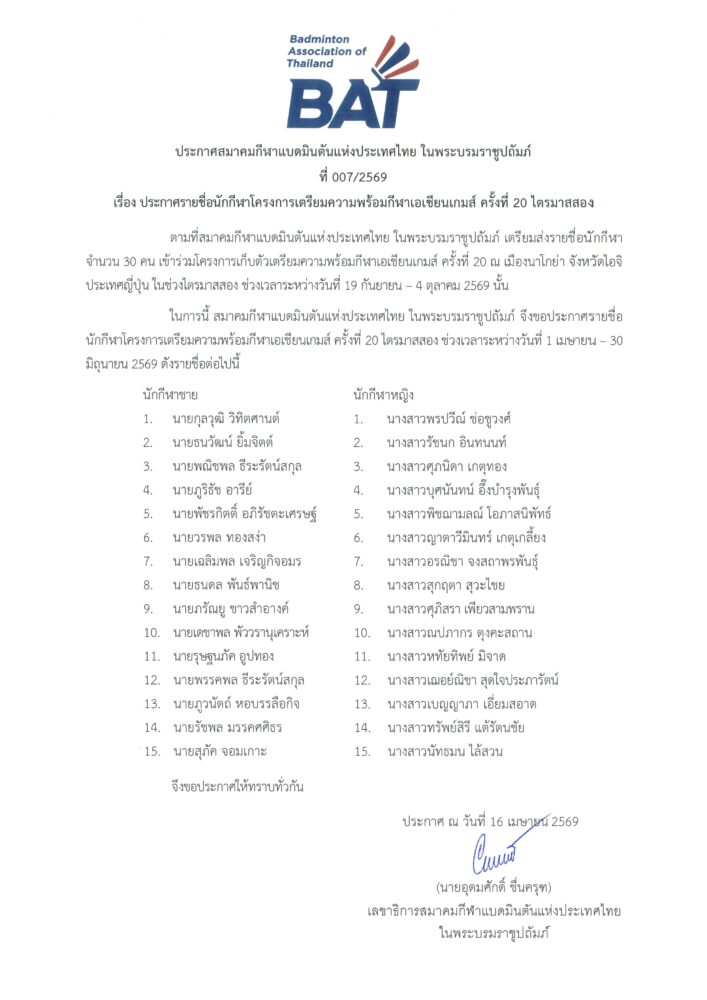 สมาคมกีฬาแบดมินตันแห่งประเทศไทย ในพระบรมราชูปถัมภ์ ออกประกาศที่ 007/2569 เรื่อง ประกาศรายชื่อนักกีฬาโครงการเตรียมความพร้อมกีฬาเอเชียนเกมส์ ครั้งที่ 20 ไตรมาสสอง เพื่อเดินหน้าแผนคัดเลือกและเตรียมความพร้อมนักกีฬาไทยสำหรับมหกรรมกีฬาเอเชียนเกมส์ ครั้งที่ 20 ที่จะจัดขึ้น ณ เมืองนาโกย่า จังหวัดไอจิ ประเทศญี่ปุ่น ในช่วงวันที่ 19 กันยายน – 4 ตุลาคม 2569