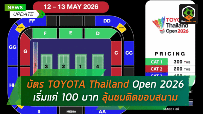 การแข่งขัน TOYOTA Thailand Open 2026 รายการใหญ่ในระดับ HSBC BWF World Tour Super 500 เปิดจำหน่ายบัตรเข้าชมอย่างเป็นทางการแล้วตั้งแต่วันนี้ ส่งสัญญาณชัดว่าศึกขนไก่รายการสำคัญที่แฟนกีฬาชาวไทยรอคอยกำลังจะระเบิดความมันส์ขึ้นอีกครั้งแบบเต็มพิกัด