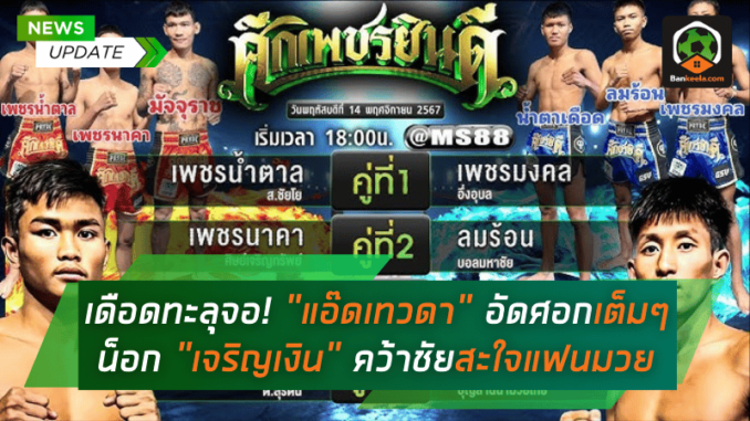 ไฟต์สุดมันส์ระอุสนาม แอ๊ดเทวดา ต.สุรัตน์ งัดฟอร์มเดือดสยบ เจริญเงิน บุญลานนามวยไทย คู่อริจากเชียงใหม่ ด้วยศอกอันทรงพลัง ส่งคู่แข่งลงไปนอนแพ้น็อกแบบสะใจในยกที่ 3 ศึกเพชรยินดี ณ เวทีราชดำเนิน เมื่อคืนวันที่ 14 พฤศจิกายน 2567