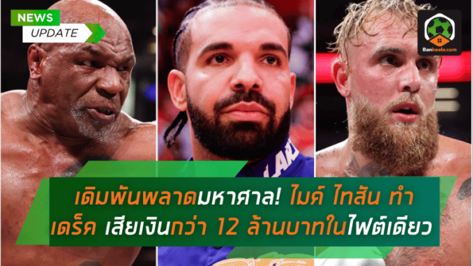 เดร็ค แร็ปเปอร์ชื่อดัง ต้องเสียเงินไปก้อนโต จากศึกมวยเดือด หลังจากวางเดิมพันให้ ไมค์ ไทสัน คว้าชัยในไฟต์พิเศษกับ เจค พอล แต่ผลลัพธ์กลับพลิกโผ เมื่อไทสันพ่ายแพ้ไปอย่างขาดลอย ทำให้แร็ปเปอร์คนดังสูญเงินมหาศาลกว่า 12.3 ล้านบาท ไปในพริบตา