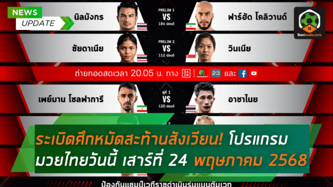 วันเสาร์ที่ 24 พฤษภาคม 2568 นี้ เตรียมตัวให้พร้อม เพราะเวทีมวยไทยทั้งประเทศพร้อมใจกันระเบิดความมันทะลุพิกัด! ไม่ว่าจะเป็น ศึกมวยไทย 7 สี, ศึก ONE ลุมพินี, ศึกจ้าวมวยไทย, ศึก RWS ราชดำเนิน เวิลด์ซีรีส์, ไทยไฟท์ หรือ ศึกเพชรยินดี ต่างขนทัพยอดมวยแถวหน้ามาโชว์ฝีมือกันแบบไม่มีใครยอมใคร บ้านกีฬา ขอสรุป โปรแกรมมวยไทยวันนี้ มาให้คอมวยทุกท่านแบบครบถ้วน พร้อมแนบลิ้งก์ ดูมวยไทย สดทุกช่องทางผ่านเครือข่าย BANKEELA ที่เดียวจบ ครบทุกคู่!