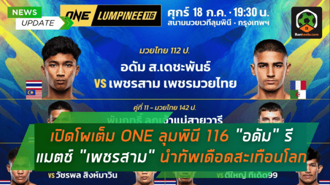 ศึก ONE ลุมพินี 116 กลับมาโหมโรงความมันอีกครั้งแบบไม่ให้แฟนมวยได้พักหายใจ เปิดโปรแกรมเต็มครบ 12 คู่ แพ็กความเดือดชนิดทะลุจอ พร้อมส่งสัญญาณสดไปกว่า 195 ประเทศทั่วโลก ดูมวยไทย กันให้เต็มอิ่ม นำทัพโดยคู่เอกสุดร้อนแรงที่แฟนๆ รอคอยอย่างการรีแมตช์ระหว่าง “อดัม ส.เดชะพันธ์” ดาวรุ่งเลือดใหม่ วัย 17 ปี ผู้สร้างปรากฏการณ์นัดแรก และ “เพชรสาม” นาห์ยัน โมฮัมเหม็ด นักสู้พันธุ์แกร่งเชื้อสายฝรั่งเศส-แอลจีเรีย วัย 16 ปี ซึ่งกระหายจะแก้มือหลังพ่ายแต้มไปแบบไม่เอกฉันท์ โดยคู่นี้จะระเบิดศึกกติกา มวยไทย พิกัด 112 ปอนด์ ถ่ายทอดสดตรงจากเวทีลุมพินี (รามอินทรา) วันศุกร์ที่ 18 กรกฎาคมนี้ เริ่มคู่แรกตั้งแต่ 19.30 น. ห้ามพลาดด้วยประการทั้งปวง