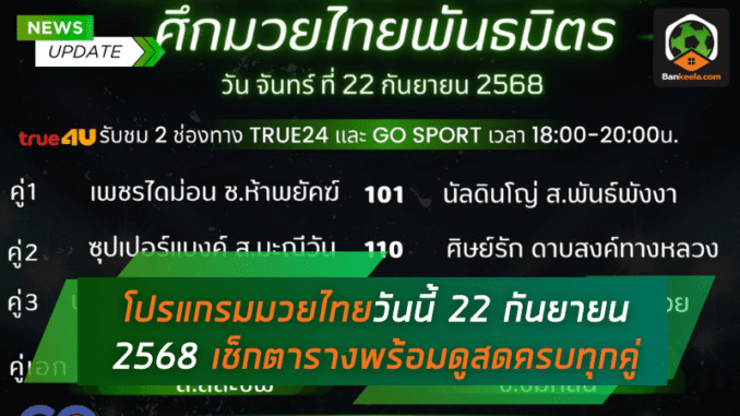 วันนี้แฟน มวยไทย ต้องไม่พลาด เพราะคืนวันจันทร์ที่ 22 กันยายน 2568 มีศึกเดือดหลายรายการรออยู่ ทั้งระดับเวทีใหญ่และรายการดังที่คอมวยทั่วประเทศเฝ้าติดตาม บ้านกีฬา ขนตารางแข่งขันพร้อมช่องทาง ดูมวยไทย มาให้ครบถ้วน ใครอยากรู้ว่าใครชกกับใคร ถ่ายทอดสดช่องไหน บทความนี้มีคำตอบ