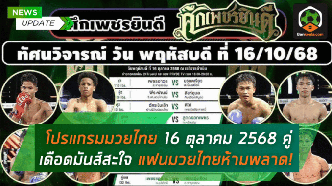 แฟน มวยไทย เตรียมระเบิดความมันส์กันอีกครั้ง! ศึกดวลเดือดค่ำคืนวันพฤหัสบดีที่ 16 ตุลาคม 2568 จัดเต็มทั้งโปรแกรมและลิ้งก์ ดูมวยไทย สดครบทุกเวทีดัง ไม่ว่าจะเป็น ศึก ONE ลุมพินี, ศึกจ้าวมวยไทย, ศึก RWS ราชดำเนิน เวิลด์ซีรีส์, ไทยไฟท์, และ ศึกเพชรยินดี งานนี้มีทั้งมวยเชิง มวยบู๊ และมวยดุดันให้ได้มันส์สะใจสายเชียร์แบบไม่มีพลาด