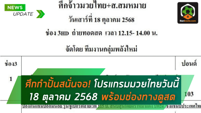 แฟนกำปั้นเตรียมลุ้นศึกเดือดแบบติดขอบจอ เพราะ โปรแกรมมวยไทยวันนี้ จัดเต็มเวทีใหญ่ทั้งวัน ตั้งแต่เที่ยงวันยันหัวค่ำ ไม่ว่าจะเป็น ศึกจ้าวมวยไทย, ศึกพีพีทีวี เกียรติเพชร Topking, ศึกจิตรเมืองนนท์, LWC Super Champ และ RWS ราชดำเนิน เวิลด์ซีรีส์ รวมดาวดังทั่วฟ้าเมืองไทยมาไว้ในคืนเดียว แถมสามารถ ดูมวยไทย ได้แบบครบทุกช่องทางผ่าน BANKEELA สำหรับคอมวยตัวจริงห้ามพลาดเด็ดขาด