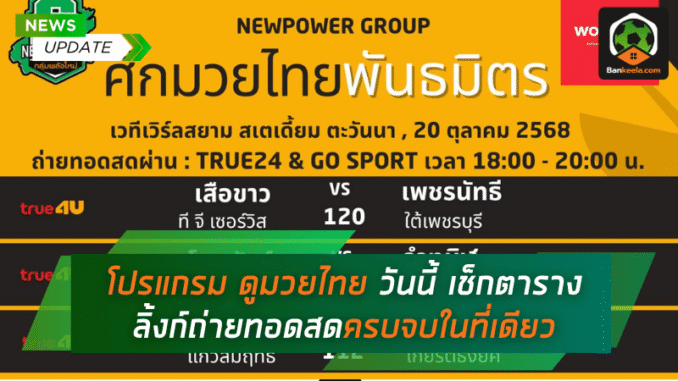 สายมวยห้ามพลาด! โปรแกรม มวยไทย ประจำวันจันทร์ที่ 20 ตุลาคม 2568 มัดรวมศึกเด็ดจากเวทีดังทั่วประเทศ ทั้งศึกมวยไทย 7 สี, ศึก ONE ลุมพินี, ศึกจ้าวมวยไทย ช่อง 3, ศึก RWS ราชดำเนิน เวิลด์ซีรีส์, ไทยไฟท์ และศึกเพชรยินดี พร้อมช่องทาง ดูมวยไทยสด ผ่าน BANKEELA และ True4U ให้แฟนมวยลุ้นเดือดติดขอบจอ