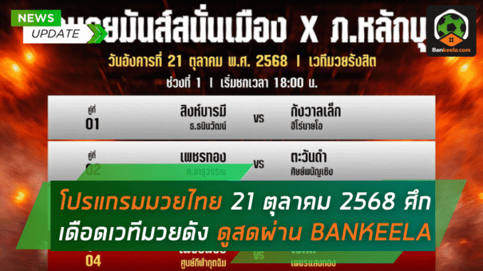 แฟนมวยไทยห้ามกระพริบตา! คืนนี้เวทีมวยทั้งประเทศพร้อมระเบิดศึกเดือดกับ โปรแกรมมวยไทย ที่ขนศึกดังมาชนกันครบ ทั้งศึกเวทีรังสิต, ONE ลุมพินี, ศึกจ้าวมวยไทย, RWS ราชดำเนิน เวิลด์ซีรีส์, ไทยไฟท์ และศึกเพชรยินดี งานนี้ ดูมวยไทย ได้ครบทุกคู่ผ่านช่องทาง BANKEELA พร้อมอัปเดต ผลมวยไทย ทันใจตลอดทั้งรายการ