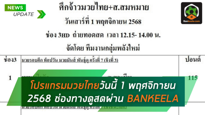 แฟน มวยไทย เตรียมระเบิดความมันในวันเสาร์ที่ 1 พฤศจิกายน 2568 กับตารางศึกดวลเดือดทั่วประเทศ ทั้งศึกจ้าวมวยไทย, ศึก ONE ลุมพินี, ศึกจิตรเมืองนนท์, RWS ราชดำเนิน เวิลด์ซีรีส์ และไทยไฟท์ พร้อมลิ้งก์ ดูมวยไทยสด ผ่านช่องทาง BANKEELA ครบทุกเวที ไม่พลาดแม้แต่หมัดเดียว