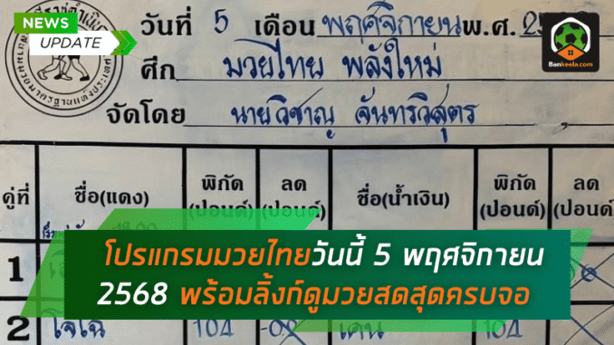 ศึกเดือดกลางสัปดาห์! โปรแกรมมวยไทยวันนี้ 5 พฤศจิกายน 2568 พร้อมลิ้งก์ดูมวยสดสุดครบจอ