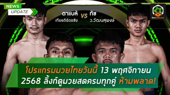 ในค่ำคืนวันพฤหัสบดีที่ 13 พฤศจิกายน 2568 แฟนมวยไทยเตรียมระเบิดความมันส์ตั้งแต่หัวค่ำ เมื่อค่ายใหญ่–ศึกดัง–นักชกตัวท็อประดับประเทศพร้อมขึ้นสังเวียนในหลายเวที ทั้ง ศึกเพชรยินดี, ONE ลุมพินี, ศึกจ้าวมวยไทย, ศึก RWS, รวมไปถึง ไทยไฟท์ เรียกได้ว่าครบเครื่องจัดหนัก ถูกใจสายเช็ก โปรแกรมมวยไทยวันนี้, คนชอบเช็ก ผลมวยไทย, และแฟนที่อยากกด ดูมวยไทย แบบสดชนิดไม่ให้พลาดแม้แต่วินาทีเดียว โดยเฉพาะผู้ชมที่ต้องการช่องทางดูผ่าน BANKEELA ก็สามารถเข้าไปรับชมได้เช่นกัน