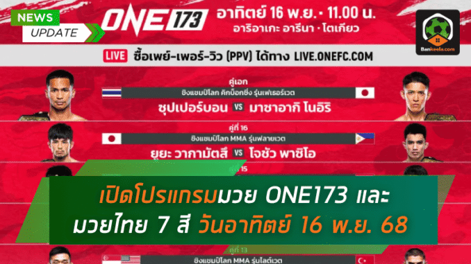 ซุปเปอร์บอนนำทัพ! เปิดโปรแกรมมวย ONE173 และมวยไทย 7 สี วันอาทิตย์ 16 พ.ย. 68 พร้อมลิงก์ดูมวยสดทาง BANKEELA