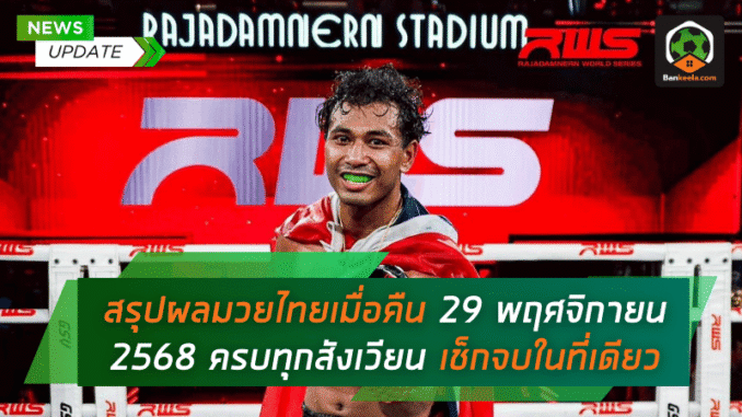 เมื่อคืนวันเสาร์ที่ 29 พฤศจิกายน 2568 แฟนมวยไทยมีคิวตามลุ้นกันแน่นทุกสังเวียน ทั้งศึกจ้าวมวยไทย, ศึกพีพีทีวี เกียรติเพชร TOPKING, ศึกจิตรเมืองนนท์ และรายการอินเตอร์อย่าง RWS ราชดำเนิน เวิลด์ ซีรีส์ ใครพลาดเปิดจอ ดูมวยไทย สด หรือมัวติดธุระจนไม่ได้ตามทัน วันนี้รวบตึงให้แล้วกับ ผลมวยไทย ทุกคู่สำคัญแบบอ่านง่าย เห็นผลชัดเจนครบทุกเวที ใช้เช็กย้อนหลัง วางแผนตามฟอร์มมวย นัดต่อไปได้สบาย
