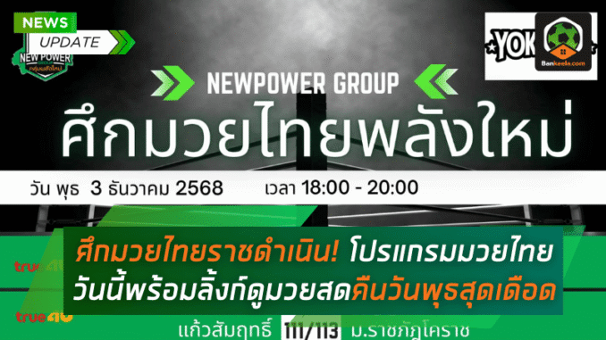 คืนวันพุธที่ 3 ธันวาคม 2568 แฟนมวยไทยเตรียมตัวให้พร้อม เพราะเวทีมวยราชดำเนินจัดศึก “มวยไทยพลังใหม่” อัดแน่นสองช่วงรายการ เอาใจคอมวยที่อยากเช็ก โปรแกรมมวยไทยวันนี้ พร้อมลุ้นคู่เดือดแบบสดๆ ผ่านจอ ภายในวันเดียวได้ดูทั้งมวยดาวรุ่งและมวยเก๋าฝีมือจัดจ้านครบทุกสไตล์