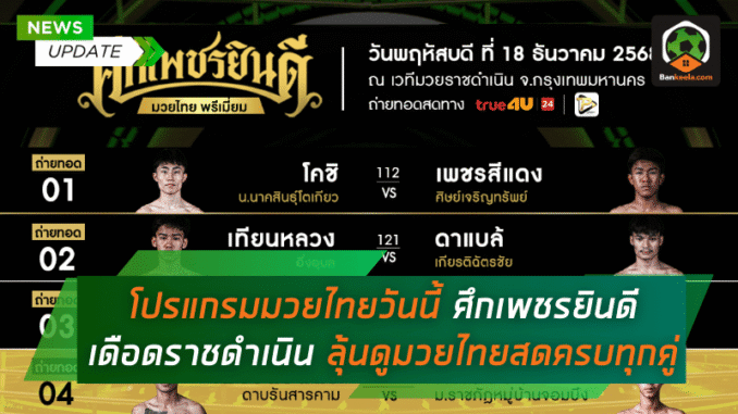 คืนวันพฤหัสบดีที่ 18 ธันวาคม 2568 นับเป็นอีกหนึ่งค่ำคืนสำหรับแฟนมวยไทยที่ห้ามพลาด ศึก เพชรยินดี บนสังเวียนราชดำเนินขนคู่มวยคุณภาพมากมายมาให้ชมทั้งช่วงแรกและช่วงสอง