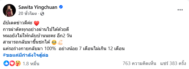 ภรรยาของตะวันฉายได้โพสต์ข้อความอัปเดตที่ทำให้แฟนมวยทั่วหน้าเพจและโซเชียลโล่งใจ โดยใจความสำคัญระบุว่าเป็น “ข่าวดี” การผ่าตัดทุกอย่างผ่านไปได้ด้วยดี ตอนนี้แพทย์ยังไม่ให้กลับบ้าน ต้องพักรักษาตัวที่โรงพยาบาลต่ออีกประมาณ 2 วัน ก่อนจะอนุญาตให้กลับไปพักฟื้นต่อที่บ้านได้