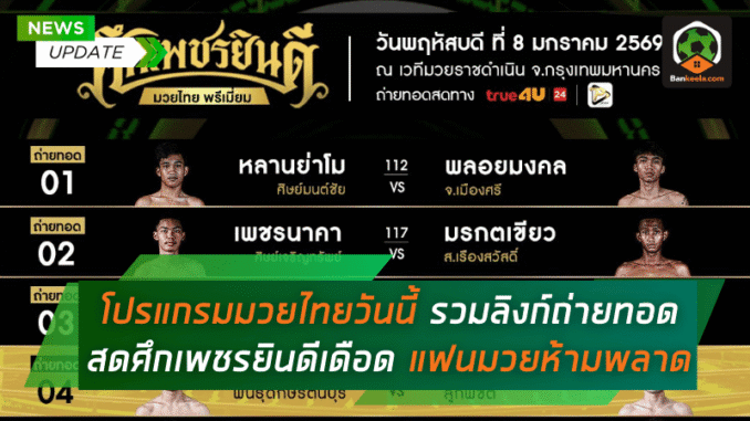 วันพฤหัสบดีที่ 8 มกราคม 2569 แฟนมวยไทยมีคิวแน่นทั้งค่ำ เพราะเวทีมวยใหญ่ในกรุงเทพฯ พร้อมใจกันเปิดศึกให้ตามเชียร์กันแบบจุใจ ไล่ตั้งแต่รายการระดับท็อปของเมืองไทยอย่าง มวยไทย 7 สี, ศึก ONE ลุมพินี, ศึกจ้าวมวยไทย ช่อง 3, ศึก RWS ราชดำเนิน เวิลด์ซีรีส์, ไทยไฟท์ ไปจนถึงศึกเพชรยินดีที่ขึ้นสังเวียนราชดำเนิน เรียกได้ว่าคืนนี้แฟนมวยเปิดทีวี เปิดมือถือแล้วแทบไม่อยากลุกไปไหน ใครเป็นสายเช็กโปรแกรม สายวิเคราะห์ หรือชอบตามผลหลังไฟต์ จัดเต็มได้ทั้งคืนกับ โปรแกรมมวยไทยวันนี้ แบบแน่น ๆ