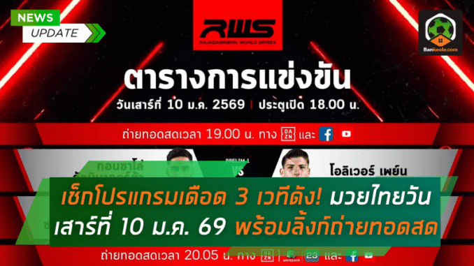 ปิดท้ายวันเสาร์ด้วยของหนักจากสนามหลวงอย่างศึก RWS ราชดำเนิน เวิลด์ ซีรี่ส์ วันเสาร์ที่ 10 มกราคม 2569 จัดที่เวทีมวยราชดำเนิน เริ่มตั้งแต่เวลา 19.00 น. ผ่านการถ่ายทอดสดทาง Youtube ช่อง WorkpointOfficial ก่อนจะยิงสดต่อบนหน้าจอ Workpoint23 เวลา 20.05 น. ให้คอมวยได้ลุ้นกันแบบไฟต์ต่อไฟต์ บรรยากาศจัดเต็มทั้งเสียงเชียร์และแสงสีในเวที