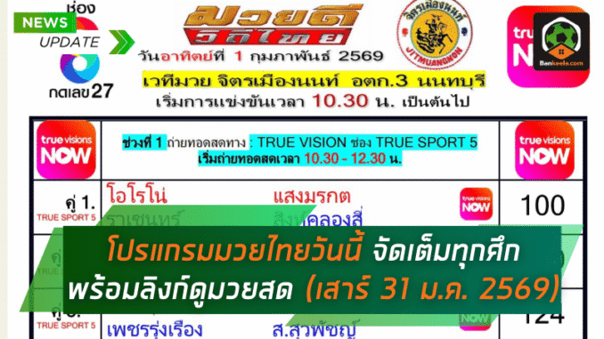 - เสาร์ที่ 31 มกราคม 2569 มี โปรแกรมมวยไทยวันนี้ แน่นทั้งวัน ตั้งแต่ศึกจ้าวมวยไทย มวยไทยเกียรติเพชร ไปจนถึง RWS ราชดำเนิน