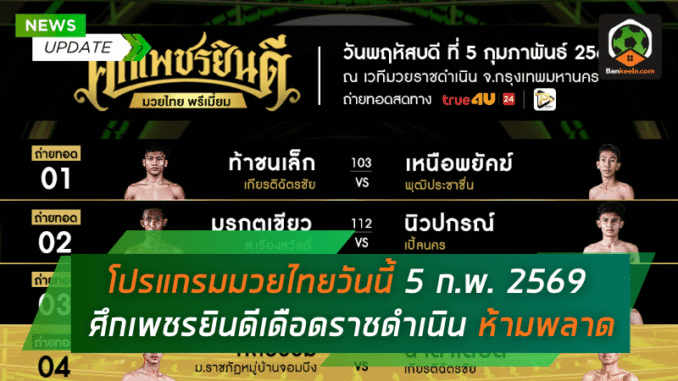 ค่ำคืนวันพฤหัสบดีที่ 5 กุมภาพันธ์ 2569 แฟนมวยมีนัดใหญ่กับ โปรแกรมมวยไทยวันนี้ ที่อัดแน่นทั้งมวยถ่ายทอดสดและมวยรายการดังตลอดทั้งคืน ไล่ตั้งแต่ มวยไทย 7 สี, ศึก ONE ลุมพินี, ศึกจ้าวมวยไทย ช่อง 3, ศึก RWS ราชดำเนิน เวิลด์ซีรีส์, ไทยไฟท์ ไปจนถึงศึกใหญ่บนสังเวียนราชดำเนินอย่าง ศึกเพชรยินดี ที่จัดมาแบบครบทุกสไตล์ ทั้งมวยเชิง มวยบู๊ และมวยสร้างกระแส