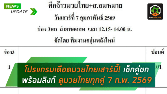 - แฟนหมัดมวยห้ามพลาด! วันเสาร์ที่ 7 กุมภาพันธ์ 2569 คือวันรวมพลคนอยากลุ้น ผลมวยไทย แบบสดๆ จัดให้ 2 รายการใหญ่ทั้งช่อง 3 และช่อง 7 ตารางชัด คู่ชกครบ เวลาเริ่มเป๊ะ ใครชอบเชียร์สายเทคนิค สายบู๊ สายดุ มีให้เลือกดูทั้งวัน แถมมีช่องทาง BANKEELA ให้ตามชมแบบเนียนๆ ไม่ต้องเสียเวลาหาลิงก์มั่ว