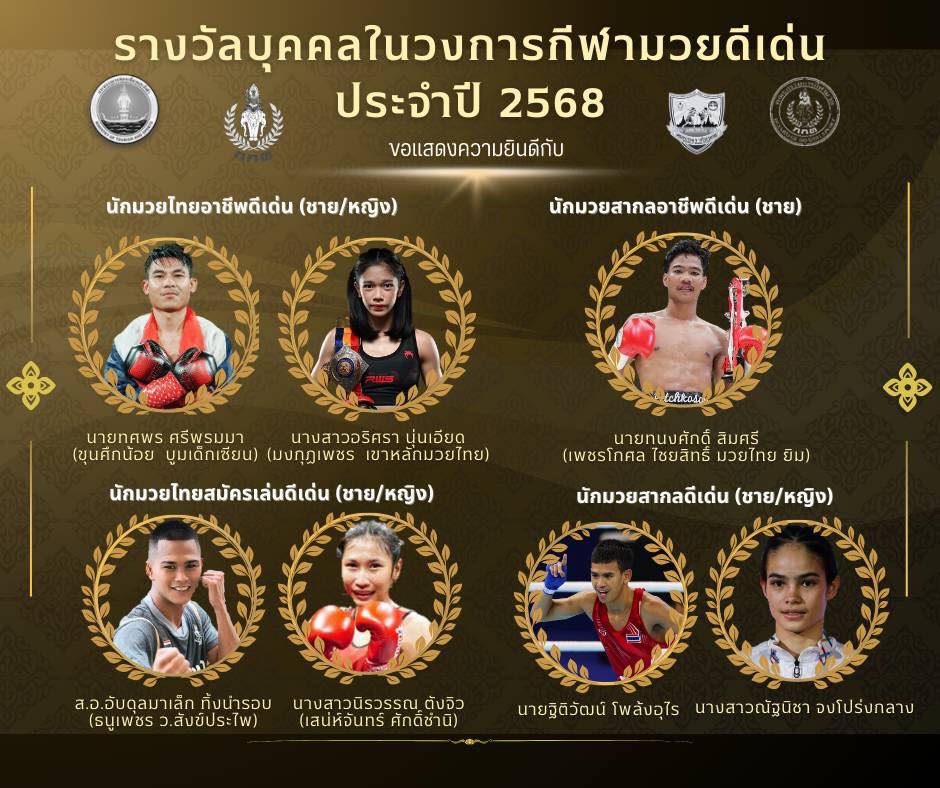 วงการหมัดมวยคึกคักรับ “วันมวยไทย” หลังมีการประกาศผล รางวัลยอดมวยแห่งปี 2568 (ปี 68) ในหมวดบุคคลวงการมวยดีเด่น เพื่อเตรียมเข้ารับรางวัลในงานเชิดชูเกียรติ “มหกรรมวันมวยไทยประจำปี 2569” ที่กำลังจะจัดขึ้นอย่างยิ่งใหญ่