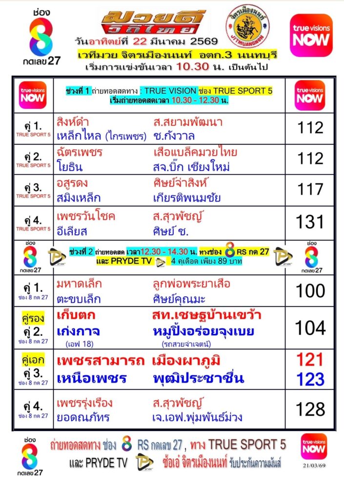 โปรแกรมมวยไทยวันนี้ วันอาทิตย์ที่ 22 มีนาคม 2569