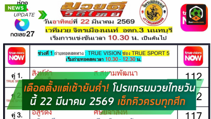 โปรแกรมมวยไทยวันนี้ วันอาทิตย์ที่ 22 มีนาคม 2569