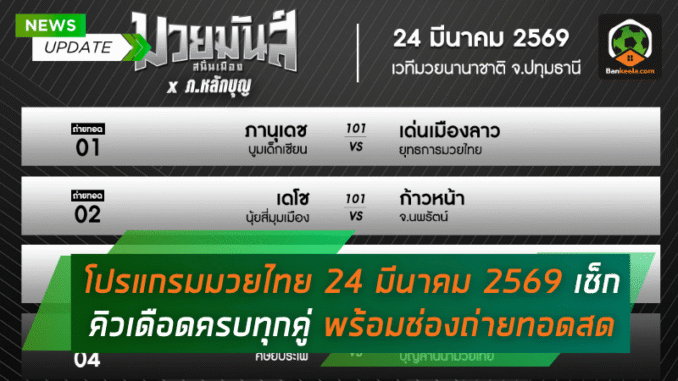 ดูมวยสดวันนี้ โปรแกรมมวยไทย 24 มีนาคม 2569 เช็กคิวเดือดครบทุกคู่ พร้อมช่องถ่ายทอดสด