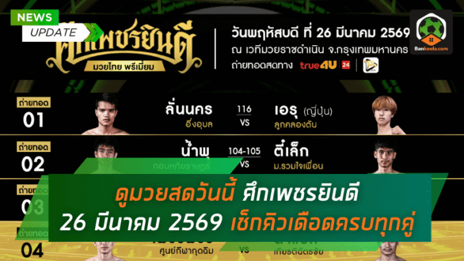 โปรแกรมมวยไทยวันนี้ วันพฤหัสบดีที่ 26 มีนาคม 2569 ยังจัดเต็มความมันส์กับศึกเพชรยินดีจากเวทีมวยราชดำเนิน แบ่งชก 2 ช่วงเวลาแบบชัดเจน ใครกำลังหา ดูมวยสด คืนนี้ บ้านกีฬา สรุปตารางแข่งขัน ช่องถ่ายทอดสด และคู่มวยสำคัญมาให้ครบแบบอ่านง่ายจบในที่เดียว