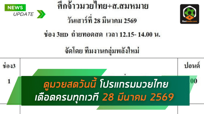ดูมวยสดวันนี้ โปรแกรมมวยไทยเดือดครบทุกเวที 28 มีนาคม 2569 เช็กตารางมวยสดพร้อมช่องถ่ายทอดสด