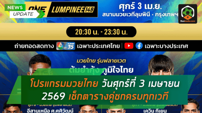 | ศึก ONE ลุมพินี ช่วงที่ 2 | ศุกร์ 3 เมษายน 2569 | 20.30 น. | เวทีลุมพินี | ช่อง 7 HD / BANKEELA |