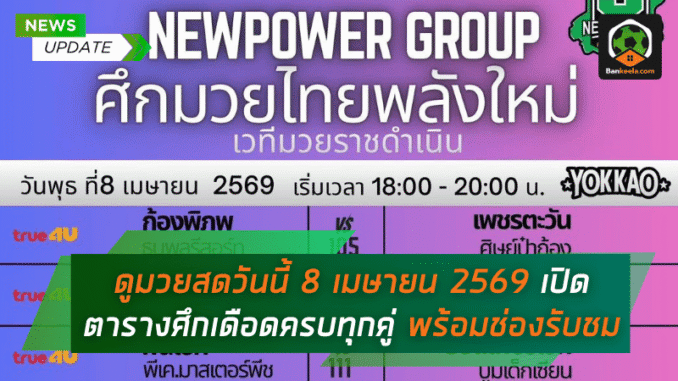 ศึกมวยไทยพลังใหม่ ช่วงที่ 2วันพุธที่ 8 เมษายน 2569 เวลา 20.15 น.เวทีมวยราชดำเนินTrue4U / BANKEELA / ▶️ คลิกดูมวยวันนี้ ดูมวยออนไลน์ ดูฟรีถ่ายทอดสดมวยได้พร้อมกันทั่วโลก (bankeela.com)