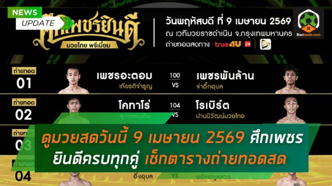 ดูมวยสดวันนี้ 9 เมษายน 2569 เปิดโปรแกรมเดือด ศึกเพชรยินดีครบทุกคู่ เช็กคิวชก ตารางถ่ายทอดสด และช่องดูมวยออนไลน์