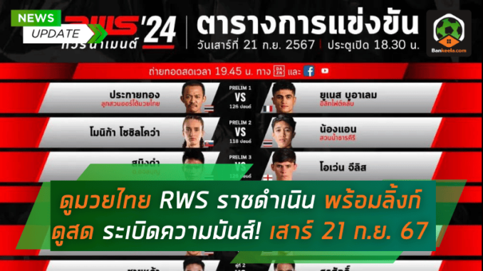 เตรียมพบกับศึกมวยไทยระดับโลก RWS ราชดำเนิน เวิลด์ ซีรี่ส์ ที่จะจัดขึ้นในวันเสาร์ที่ 21 กันยายน 2567 ณ สนามมวยเวทีราชดำเนิน ศึกครั้งนี้เต็มไปด้วยนักชกฝีมือดีทั้งชาวไทยและต่างชาติ ที่พร้อมจะปะทะกันอย่างดุเดือดเพื่อแย่งชิงความเป็นหนึ่งบนเวทีเก่าแก่ที่เต็มไปด้วยประวัติศาสตร์ ราชดำเนิน เวิลด์ ซีรี่ส์ งานนี้เริ่มตั้งแต่เวลา 19.45 น. จะถ่ายทอดสดทาง WorkpointOfficial และ บ้านกีฬา ตั้งแต่เวลา 21.15 น. แฟนมวยไทยไม่ควรพลาด เตรียมรับชมได้เลย!