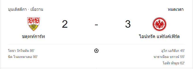 การดวลกันในศึกบุนเดสลีกานัดนี้เต็มไปด้วยจังหวะการทำประตูที่น่าประทับใจ ฝั่งแฟร้งค์เฟิร์ตที่บุกมาคว้าชัยสำเร็จด้วยความเฉียบคมในการจบสกอร์ ขณะที่สตุ๊ตการ์ตก็แสดงให้เห็นถึงการสู้กลับอย่างไม่ย่อท้อ เรียกได้ว่าเป็นเกมที่แฟนบอลไม่ควรพลาดจริง ๆ