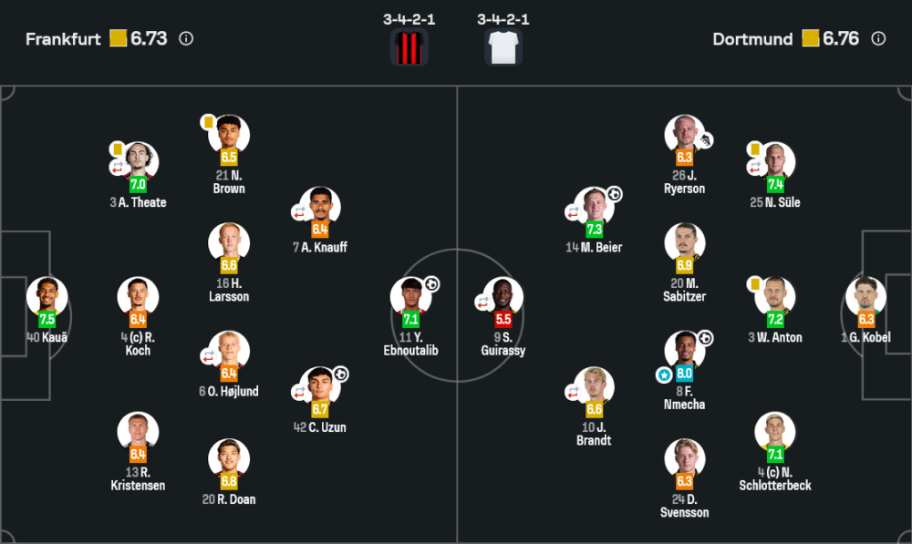 ฝั่งแฟรงก์เฟิร์ต ต้องยกให้ มาห์มูด ดาอูด กับ ยูนุส เอบนูตาลิบ ที่ทำประตูสำคัญและสร้างอันตรายตลอด ขณะที่ดอร์ทมุนด์มี เฟลิกซ์ เอ็นเมชา, นิกลาส ซือเล และมักซิมิเลียน ไบเออร์ ที่รักษามาตรฐานสูงทั้งเกม