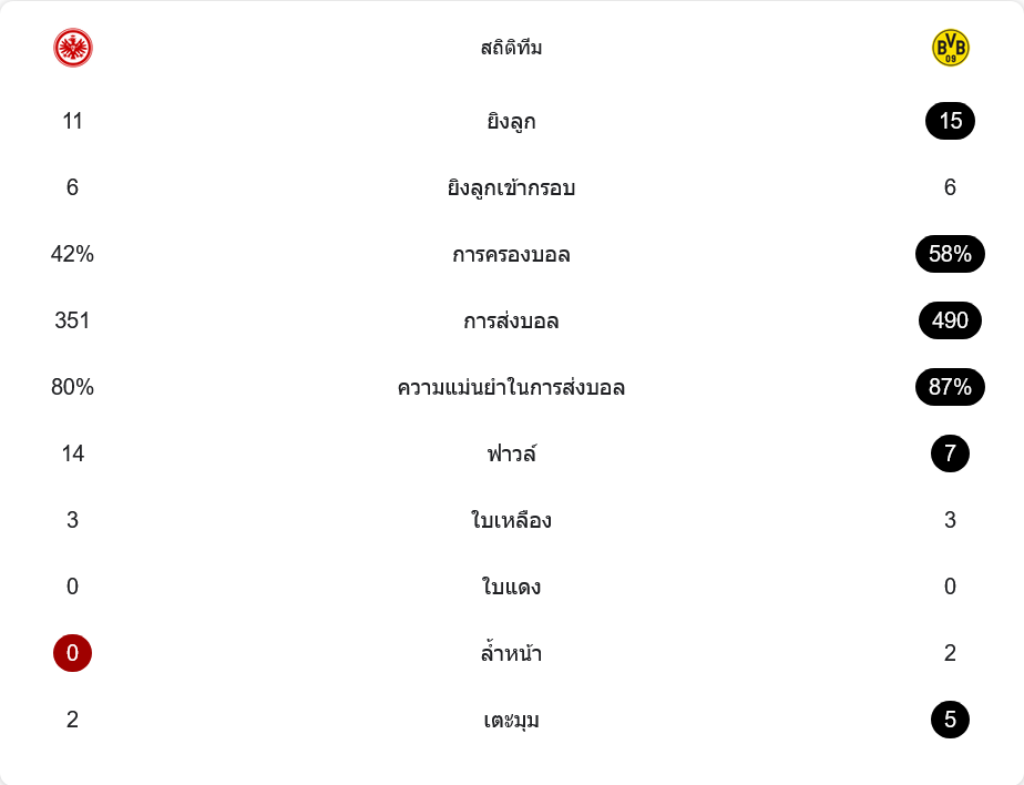 ตัวเลขหลังเกมยืนยันว่าแมตช์นี้สูสีและเปิดหน้าแลกกันสนุก แฟรงก์เฟิร์ตยิงทั้งหมด 11 ครั้ง เข้ากรอบ 6 ครั้ง ส่วนดอร์ทมุนด์ได้โอกาสมากกว่า 15 ครั้ง เข้ากรอบ 6 ครั้งเช่นกัน ทีมเยือนครองบอลเหนือกว่า 58% ต่อ 42% ส่งบอล 490 ต่อ 351 ครั้ง และมีความแม่นยำการจ่ายที่ 87% เหนือกว่าเจ้าบ้านที่ 80%